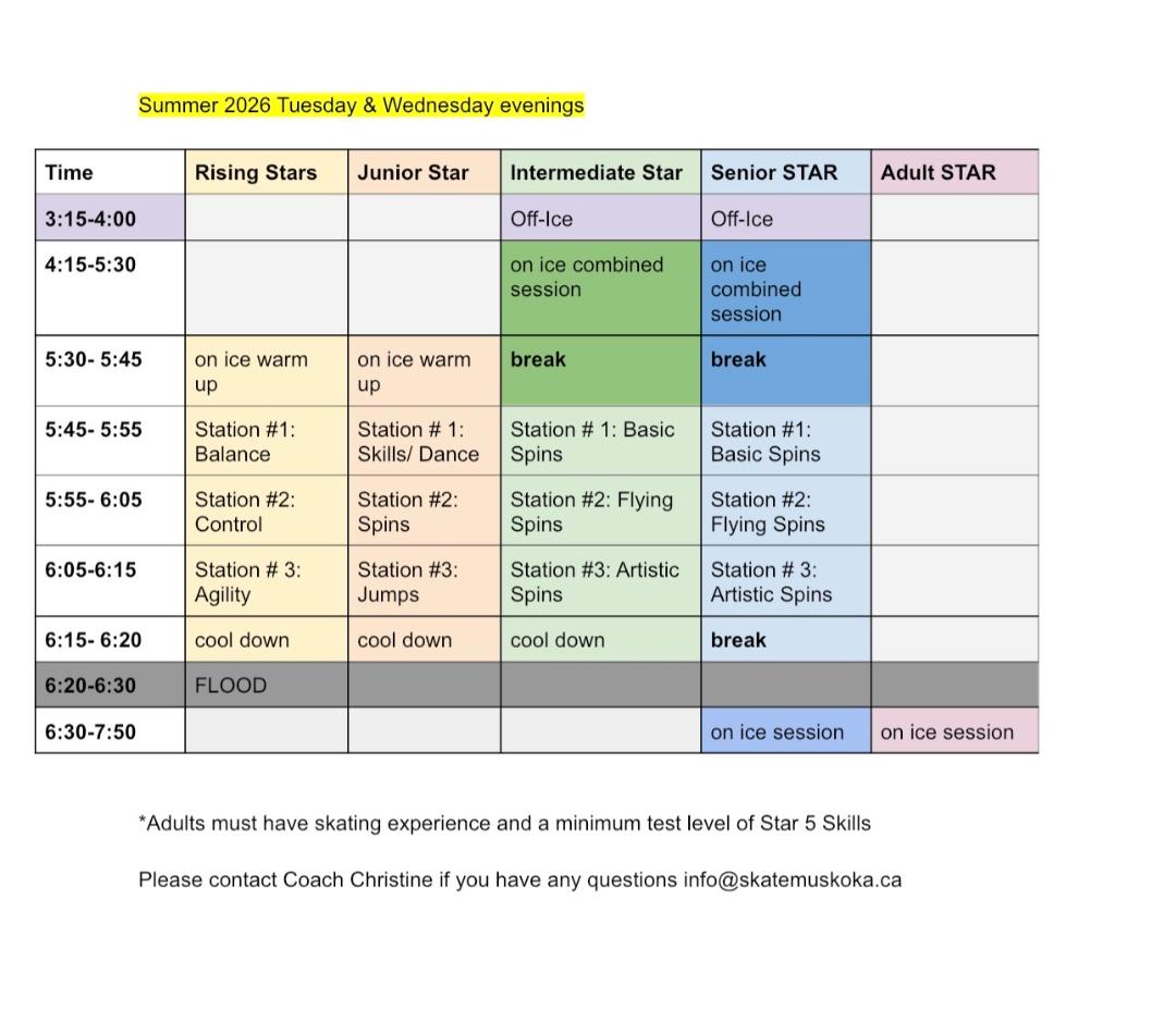 Summer 2026 Registrations opens April 7. All Summer sessions will take place at the Muskoka Lumber Community Centre. Full Registrations can be purchased as a Program. Individual drop in tickets and packages of 5 and 10 tickets are also available for purchase as a Product on the left hand side of the Registration page. Summer Sessions begin June 30 and end August 36. No skating July 1.